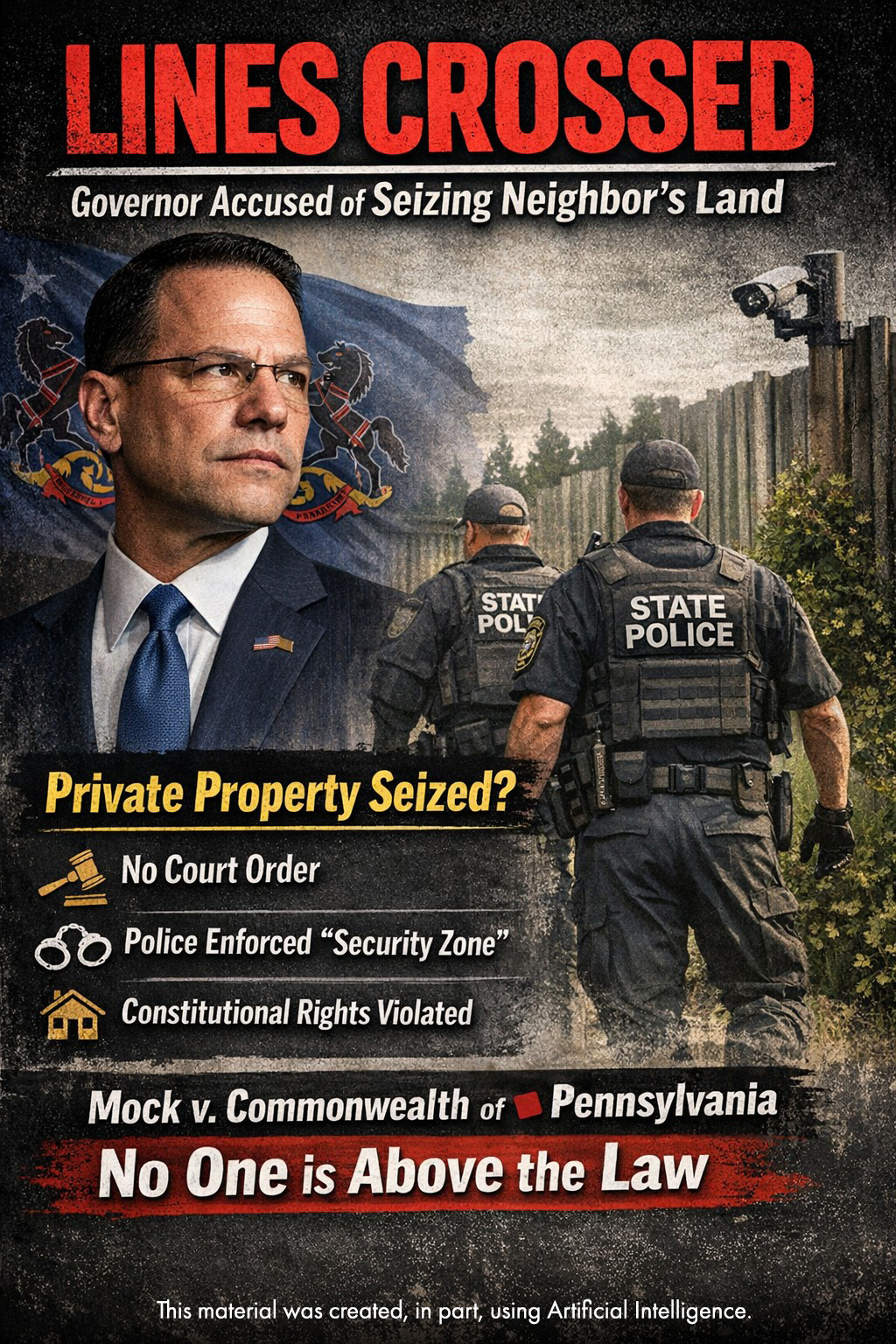 In the lawsuit Mock v. Commonwealth of Pennsylvania, Jeremy and Simone Mock allege Gov. Josh Shapiro and his wife, Lori, commandeered a strip of their property after failed attempts to buy or lease it. According to the complaint, what began as a routine neighborly boundary conversation spiraled into a full-blown constitutional showdown.
