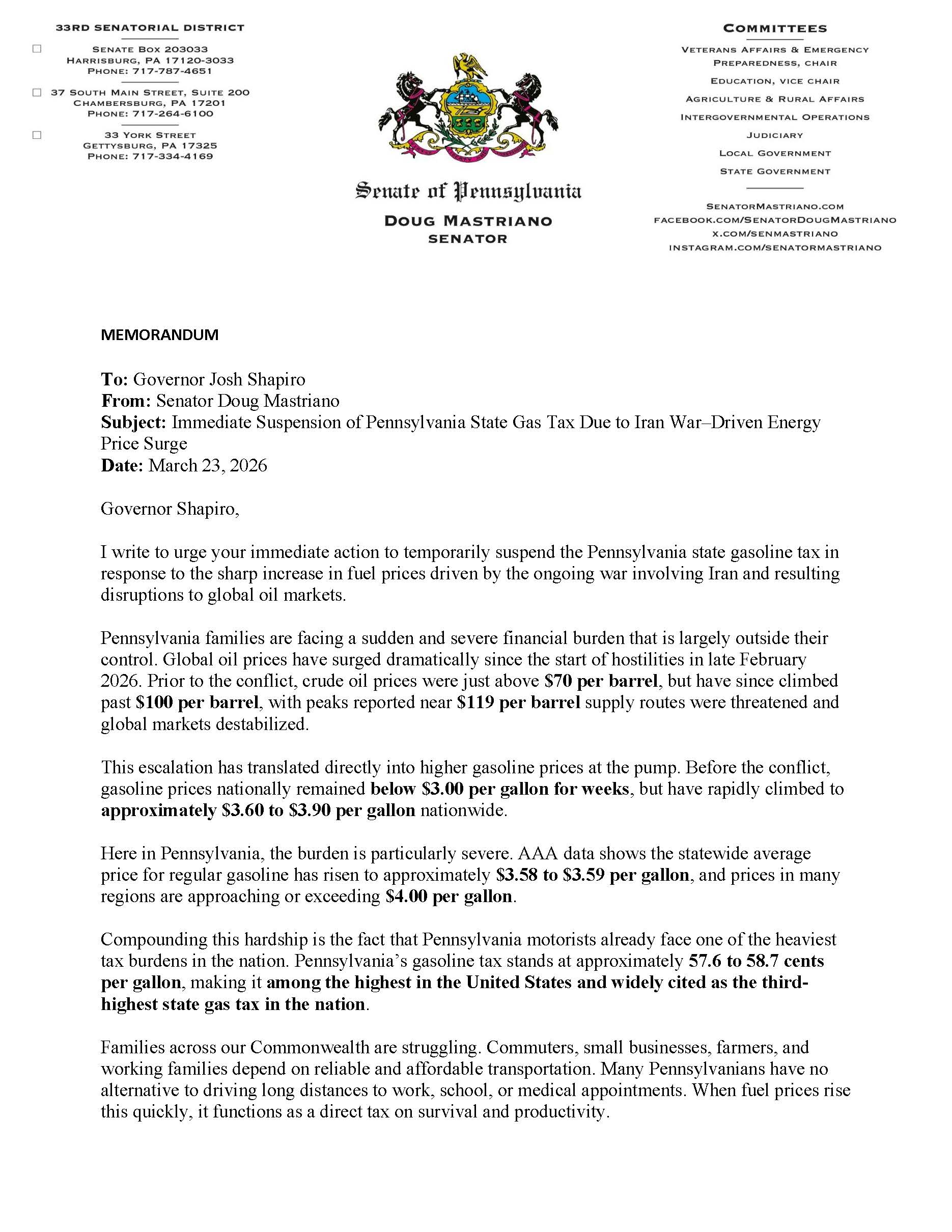 A mother in Pennsylvania should not have to choose between filling her gas tank and feeding her children—but that is exactly the reality many families are facing today. Across our Commonwealth, working people are not just noticing higher prices at the pump—they are feeling fear, frustration, and financial strain that grows with every gallon purchased. This is not about inconvenience. It is about survival. When fuel prices surge this rapidly, they do more than strain budgets—they threaten livelihoods, disrupt families, and punish people who are simply trying to get to work and care for those they love. Since the outbreak of conflict involving Iran, global oil markets have surged, driving gasoline prices sharply higher across the country and here at home. What was once a manageable expense has become a growing burden that families cannot escape. And in Pennsylvania, that burden is made heavier by one of the highest gasoline taxes in the nation—nearly 58 cents per gallon—piling state-imposed costs onto an already worsening crisis. This is not just an economic issue—it is a moral one. Government exists to serve the people, especially in moments of crisis. When families are hurting, leadership is not measured by patience or process—it is measured by action. Doing nothing while families struggle is not neutrality. It is a decision—a decision to allow hardship to deepen when relief is possible. Across Pennsylvania, the impact is being felt everywhere. For many residents—especially in rural communities—driving is not optional. It is essential. People must travel miles to reach their workplaces, schools, farms, and hospitals. Truckers who deliver our goods, farmers who feed our nation, and small business owners who keep local economies alive are absorbing higher fuel costs every day. Those costs do not disappear—they are passed on to consumers in the form of higher prices for food, materials, and services. At kitchen tables across our Commonwealth, families are making impossible choices: Do we fill the tank or fill the refrigerator? Do we make it to work this week or delay paying the electric bill? These are not theoretical concerns. They are happening now. And the hardship is compounded by policy choices made here at home. Pennsylvania maintains one of the highest gasoline taxes in America. At a time when global conflict has driven fuel prices upward, continuing to collect one of the nation’s heaviest per-gallon taxes places an extraordinary burden on the very people government is meant to protect. Other states have demonstrated that relief is possible. During periods of sharp fuel price increases, states such as Georgia have temporarily suspended their gas taxes to provide immediate financial relief to residents. Pennsylvania should not lag behind while our citizens struggle to keep up. Suspending the state gas tax—temporarily and responsibly—would provide immediate breathing room to families already stretched thin by inflation. It would help stabilize small businesses facing rising transportation costs. It would support farmers working to sustain food production and truckers working to keep supply chains moving. And most importantly, it would signal that government understands the urgency of this moment and is willing to act. Critics will argue that gas tax revenue supports infrastructure, and they are correct—our roads and bridges matter. But infrastructure exists to serve people, not the other way around. In times of extraordinary hardship, government must place the needs of families first. Temporary relief in a time of crisis is not reckless—it is responsible. This is not a partisan issue. It is not about ideology. It is about survival for working families who are doing everything right yet falling further behind through no fault of their own. Leadership is tested in moments like this. Not when times are easy—but when families are hurting. Every day of delay costs Pennsylvanians more money they cannot afford to lose. Every week without relief tightens the financial strain on households already stretched to their limits. And every month of inaction risks pushing more families to the brink. Pennsylvania families do not need sympathy. They need relief. Suspend the gas tax—temporarily, responsibly, and immediately—until global energy markets stabilize and prices return to manageable levels. Because when families are hurting this badly, waiting is not leadership. Act now. Throwback!Rebbie and me in our college days—young, carefree, and full of laughter, with little Kinky and Baby Cat bringing us endless joy. These were the days that filled our hearts with friendship, love, and memories that still make me smile. Senate Acts to Protect Workers’ Compensation for First Responders